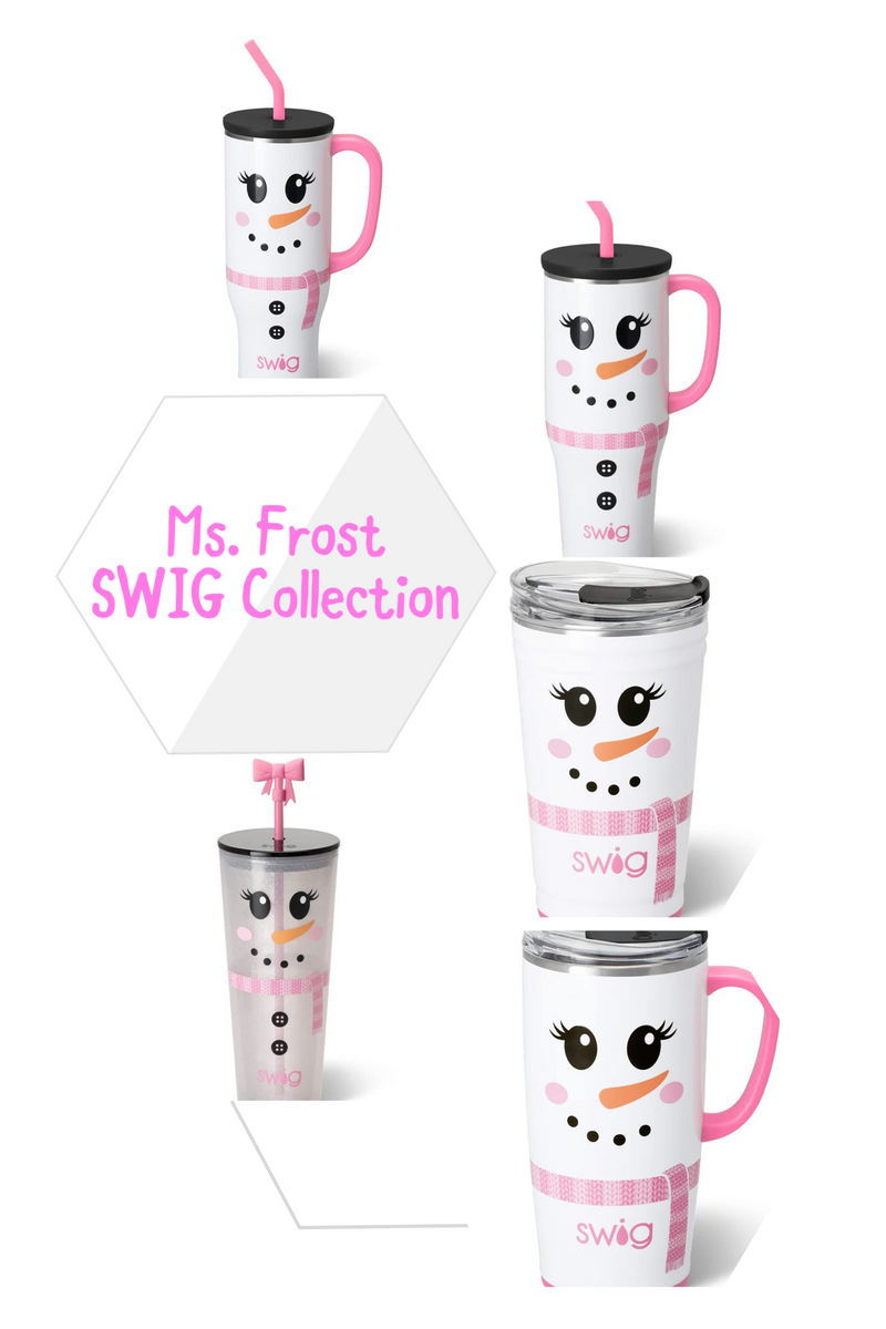 Thumpity thump here comes Frosty made of glitter white snow and dressed in a knitted Pink Scarf. Available in the 40 & 30 ounce mega meg, the 24 ounce party cup, 18 ounce travel mug, and 24 ounce plastic tumbler with pink bow straw.