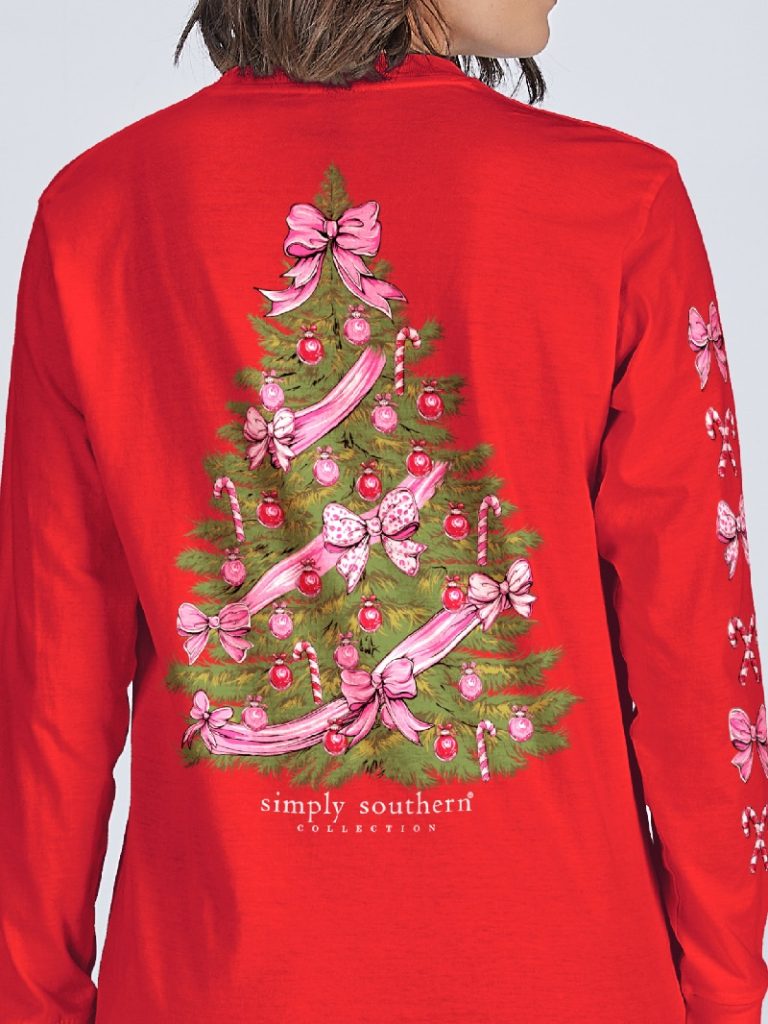 Red long sleeve shirt with a large Christmas tree decorated in pink and red. Simply Southern logo below. Candy canes and bows along right sleeve and on left chest. 100% cotton. Unisex sizing Available in Adult and Youth Sizes